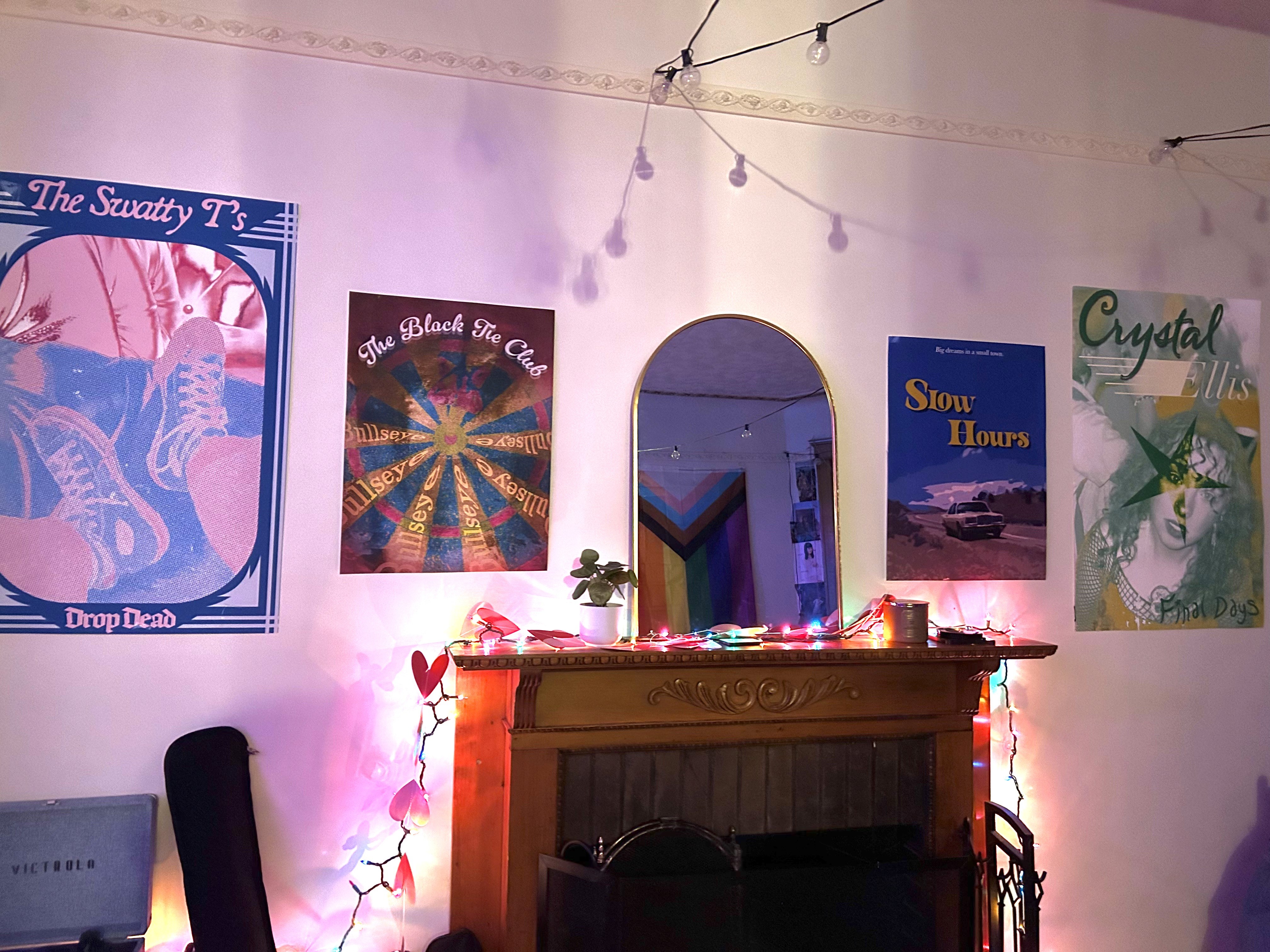I found references online of posters of the time and attempted to follow their aesthetics. They are meant to add more interest to the background of the main character's bedroom scenes as well as some living room scenes. All the photos are my own or my friends donation, and all the textures are from Texture Labs.