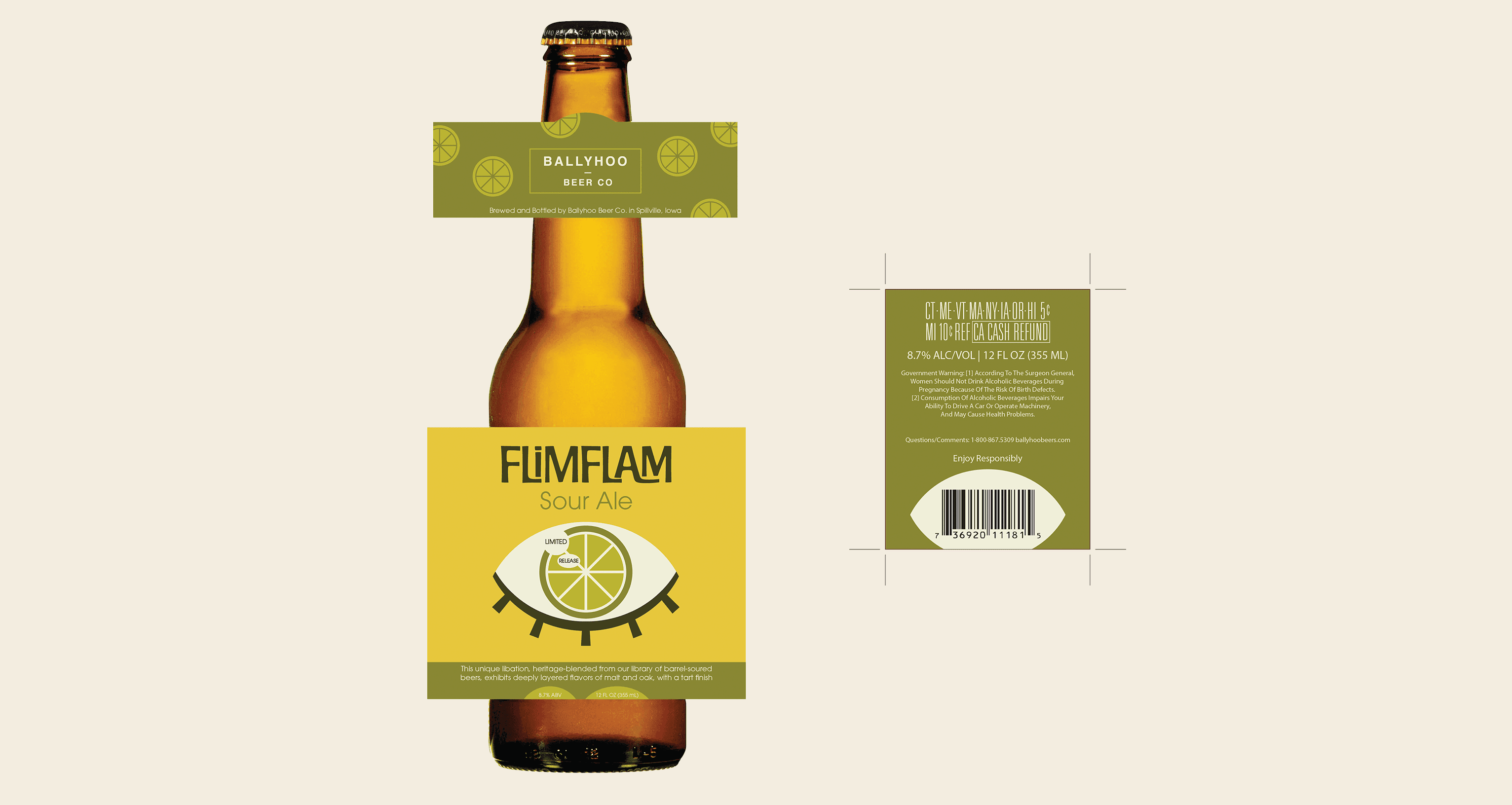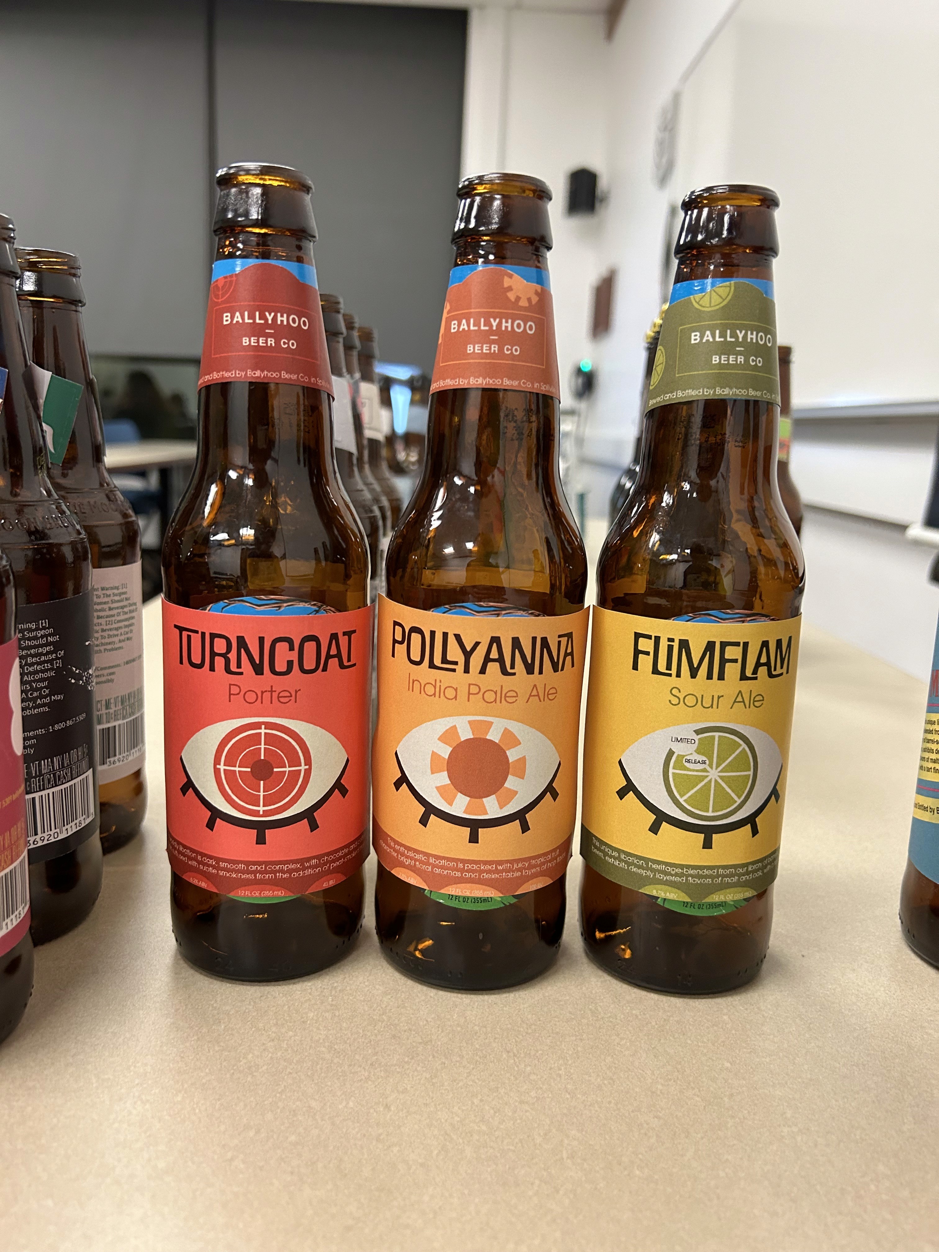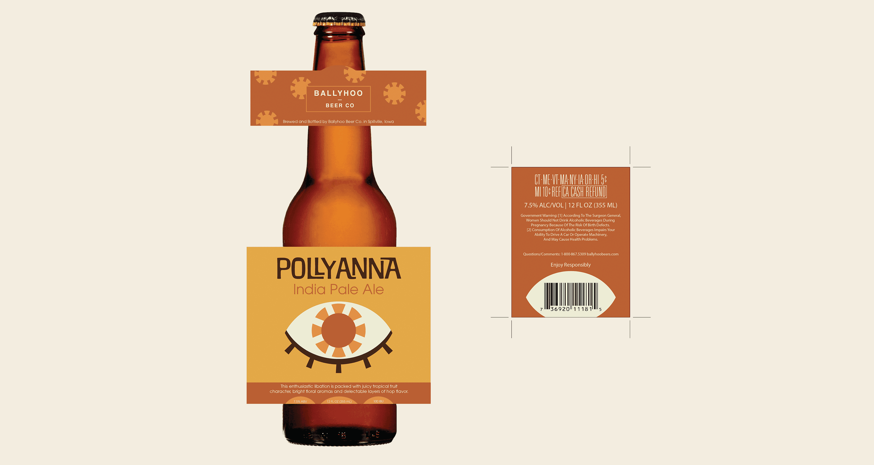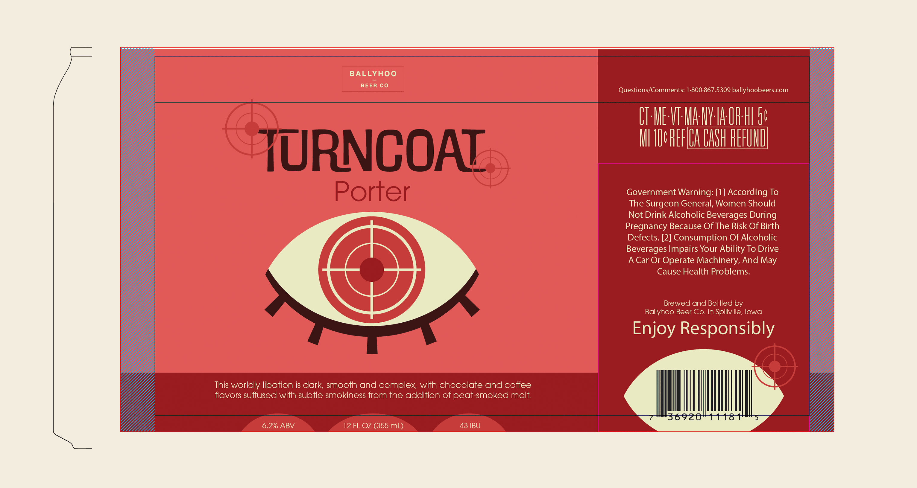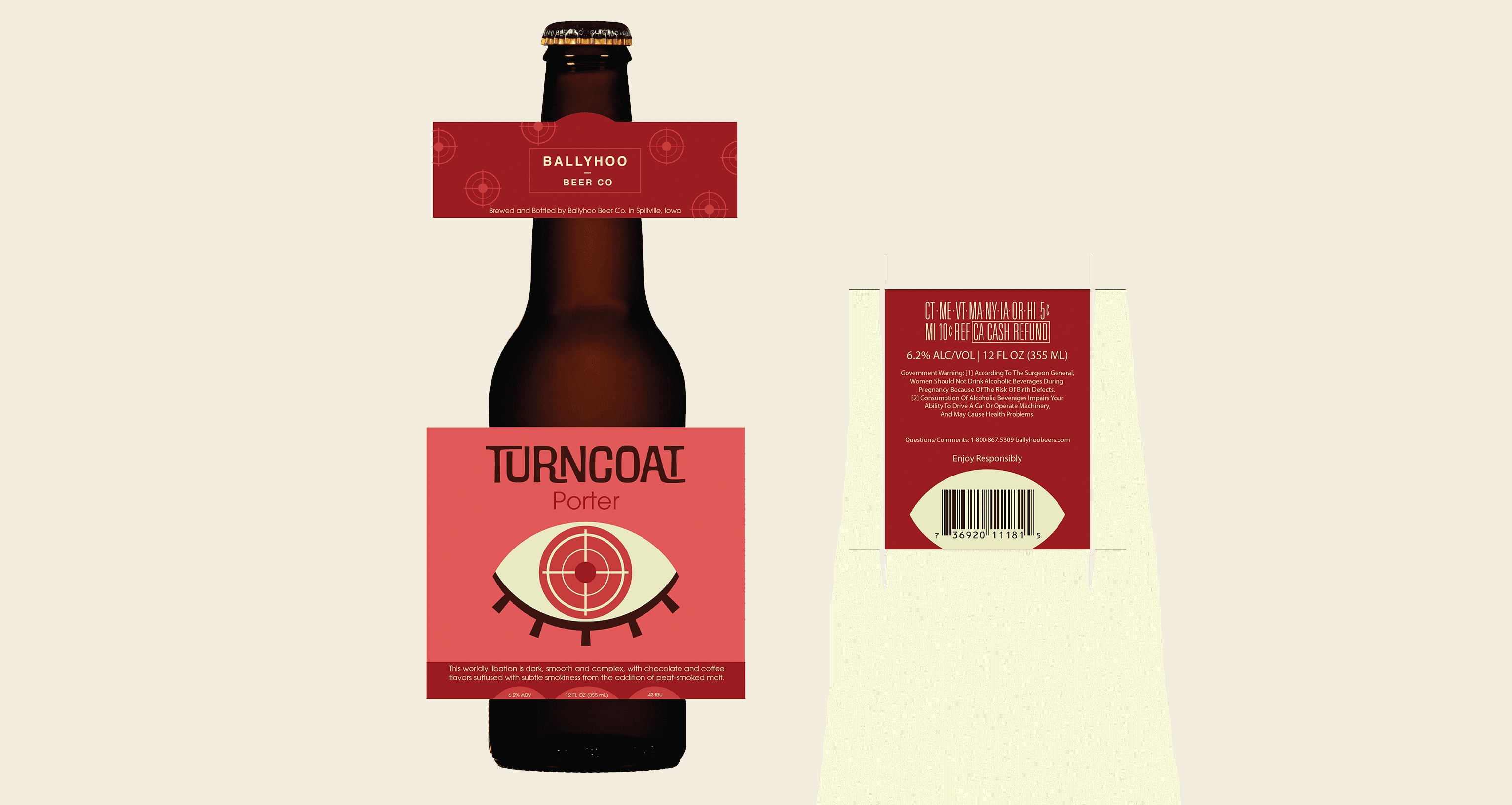 The through-line is the central eye and structure of the design, however, the iris of the eye correlates to themes associated with each beer name and type. The colors were drafted not only to compliment the aesthetic that the name provides, but also to mesh well with the natural color of the associated beer. These beers are meant to stand out on the shelf with their bright simplicity and forward marketing.