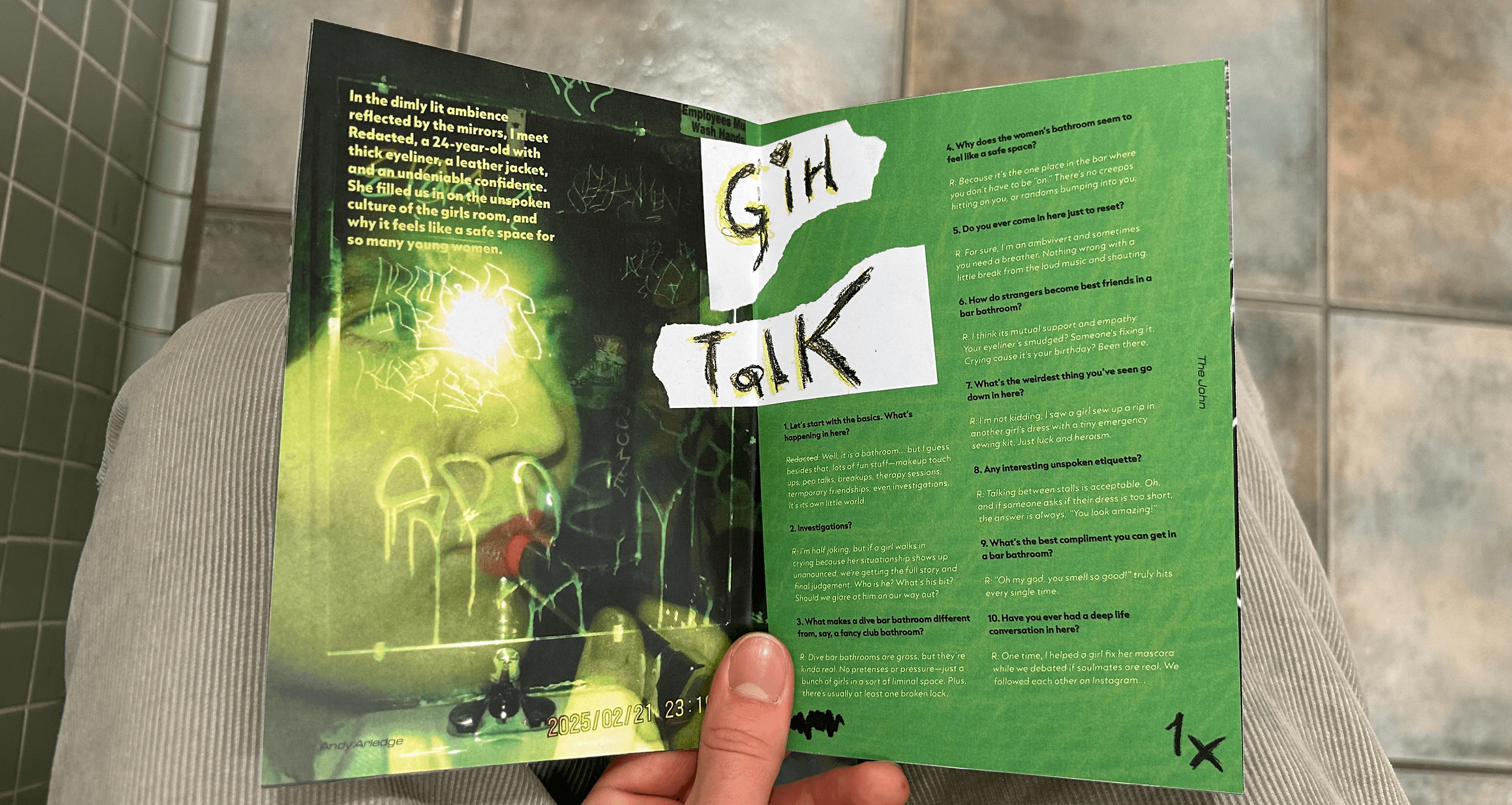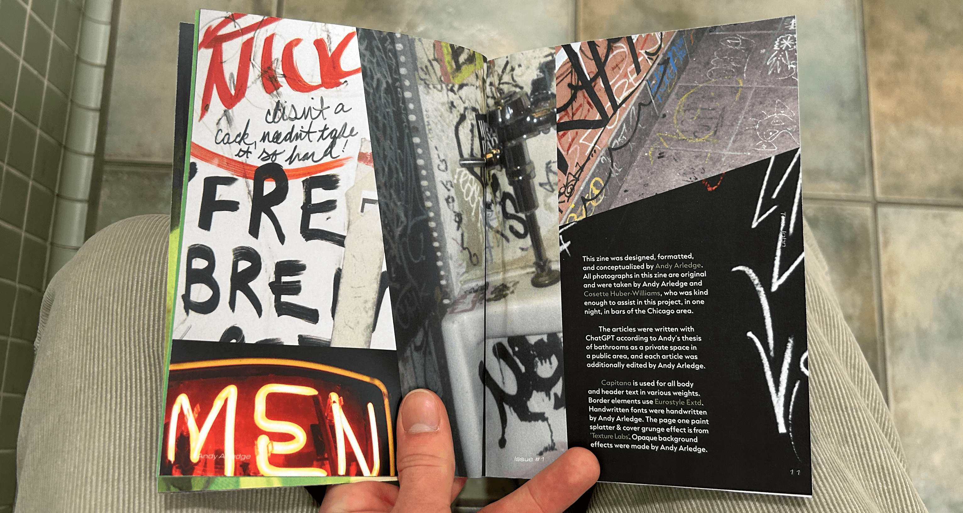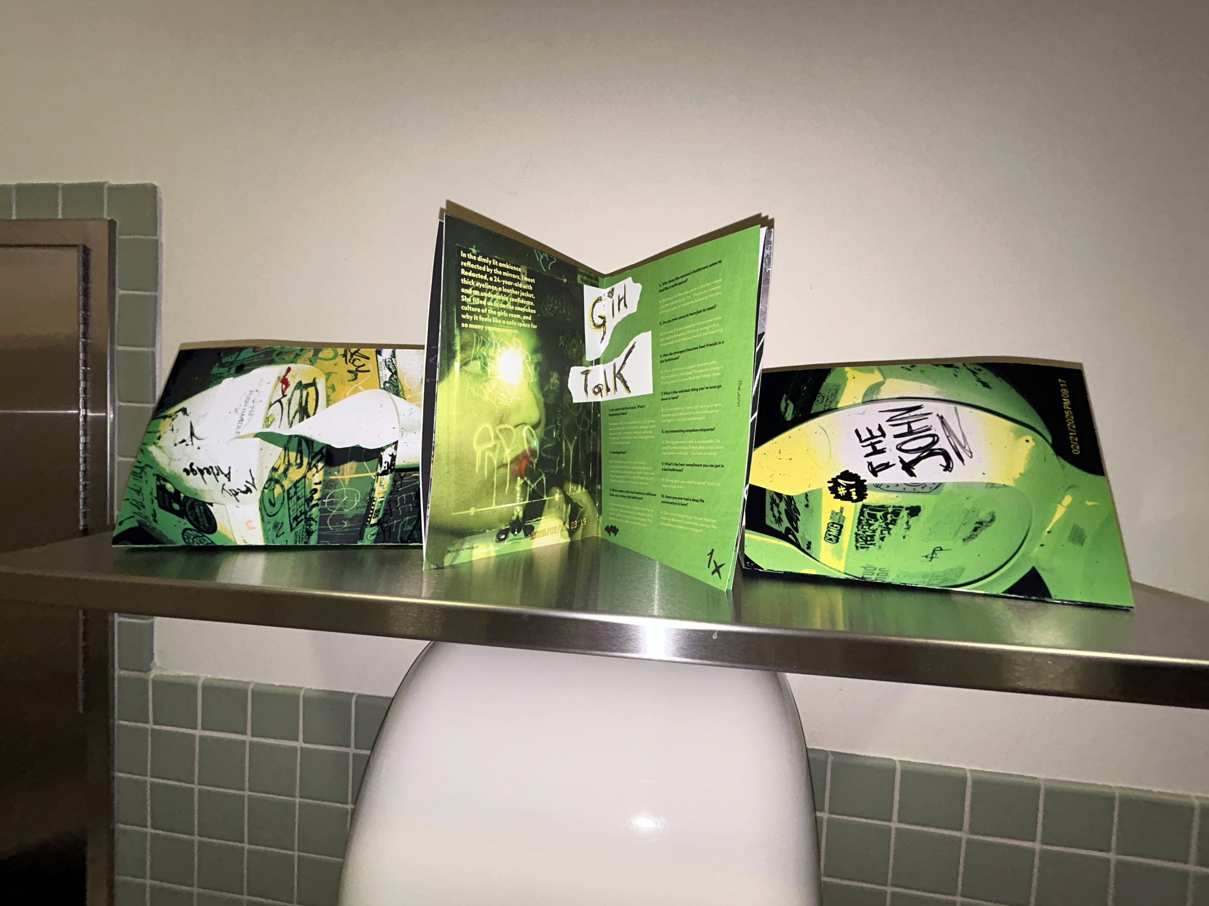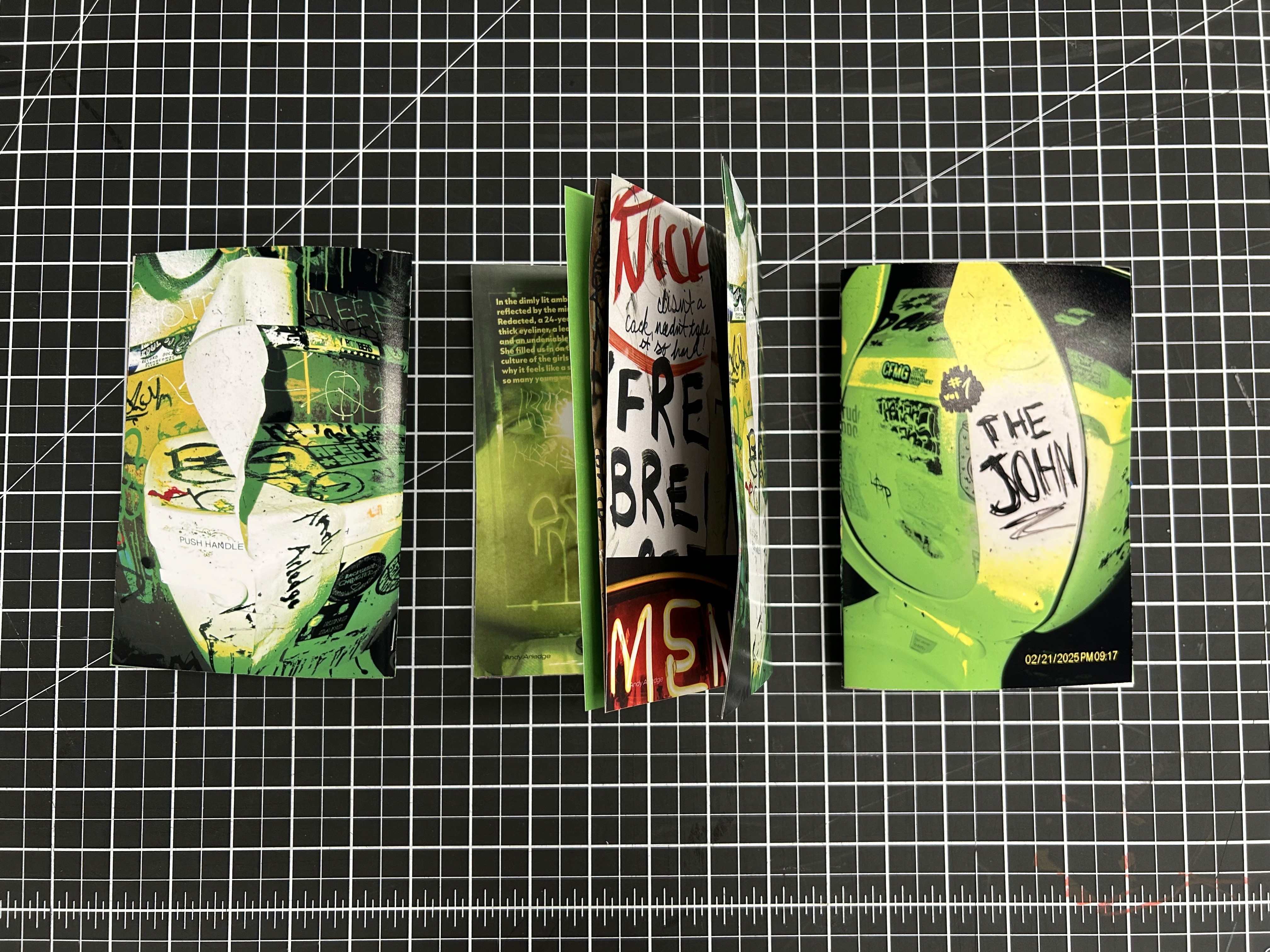 I went barhopping, with a dedicated friend, around Chicago for a night, and tried to scope out the most interesting areas of each bathroom we visited. We put a cut up green ping pong ball in front of the camera flash to achieve a sickly green color, and utilized our fish eye lens to make everything extra disorienting. Anything written on, textured, or destroyed was fair game, and to bring some authenticity to the zine, the cover photos were created physically. I scanned in collaged elements, hand wrote captions and pull quotes, crossed out page numbers, and rotated grids all to honor the feeling of the spaces.