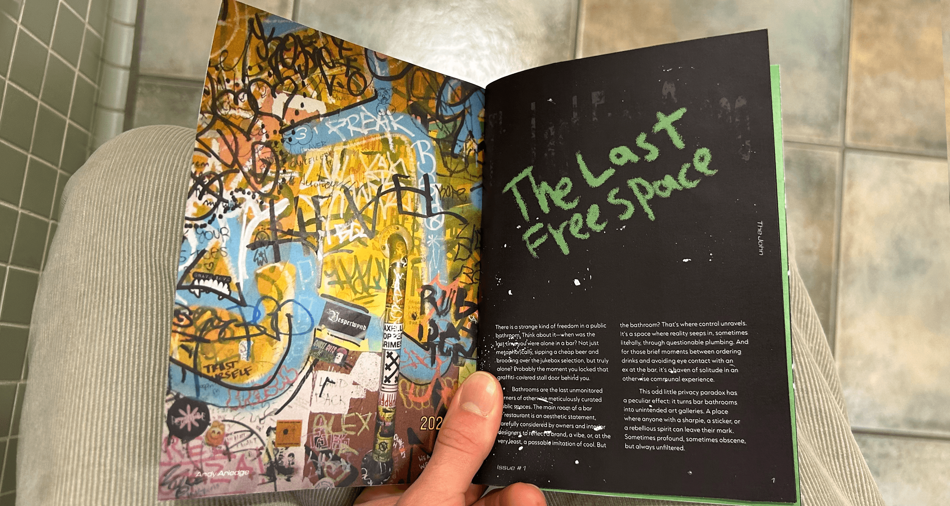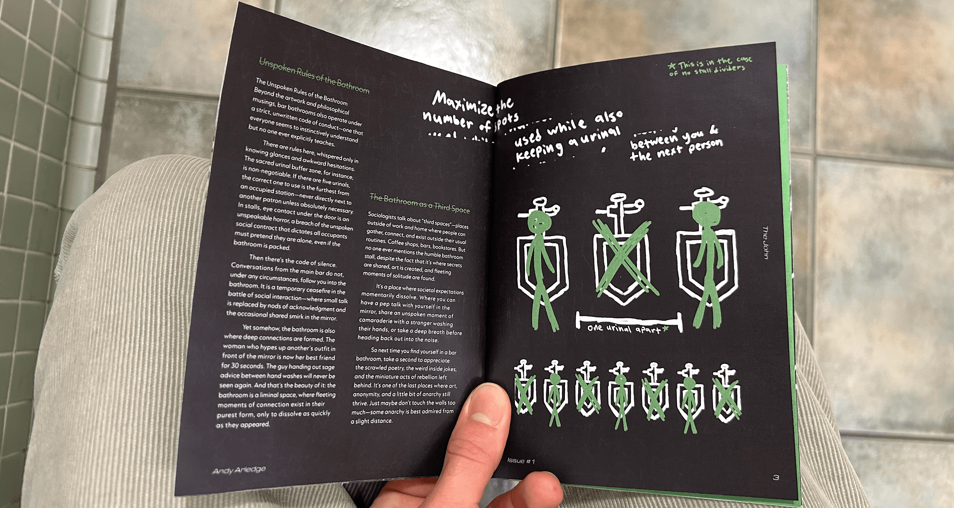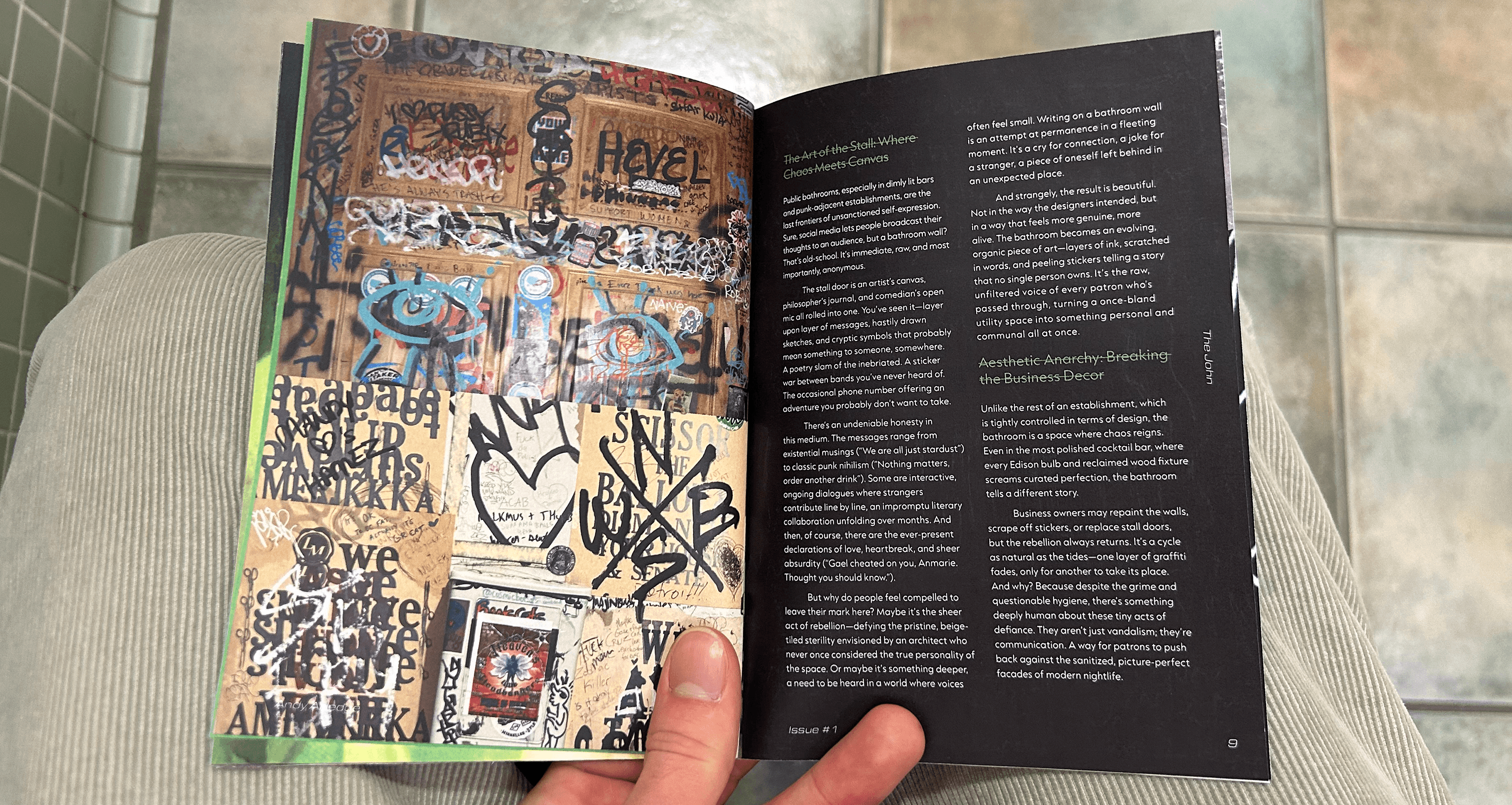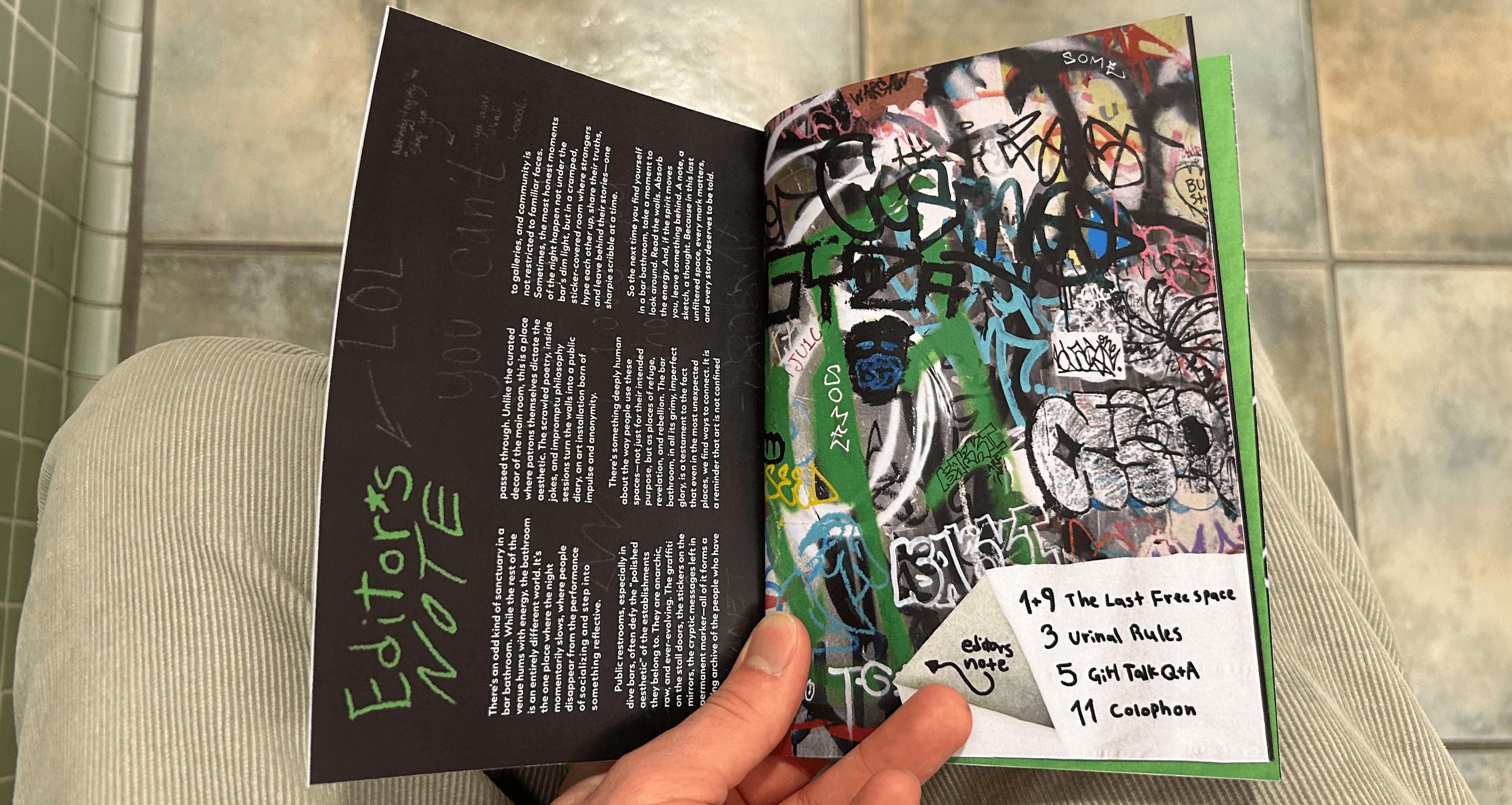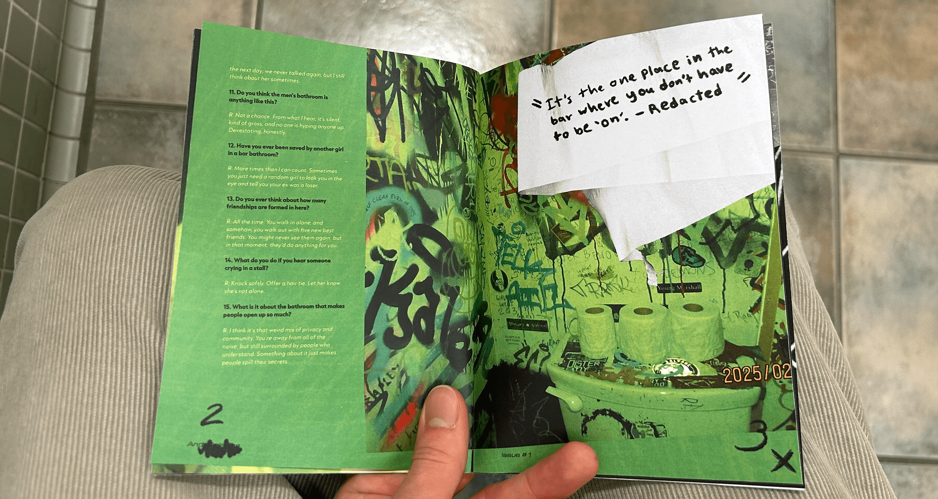 I went barhopping, with a dedicated friend, around Chicago for a night, and tried to scope out the most interesting areas of each bathroom we visited. We put a cut up green ping pong ball in front of the camera flash to achieve a sickly green color, and utilized our fish eye lens to make everything extra disorienting. Anything written on, textured, or destroyed was fair game, and to bring some authenticity to the zine, the cover photos were created physically. I scanned in collaged elements, hand wrote captions and pull quotes, crossed out page numbers, and rotated grids all to honor the feeling of the spaces.